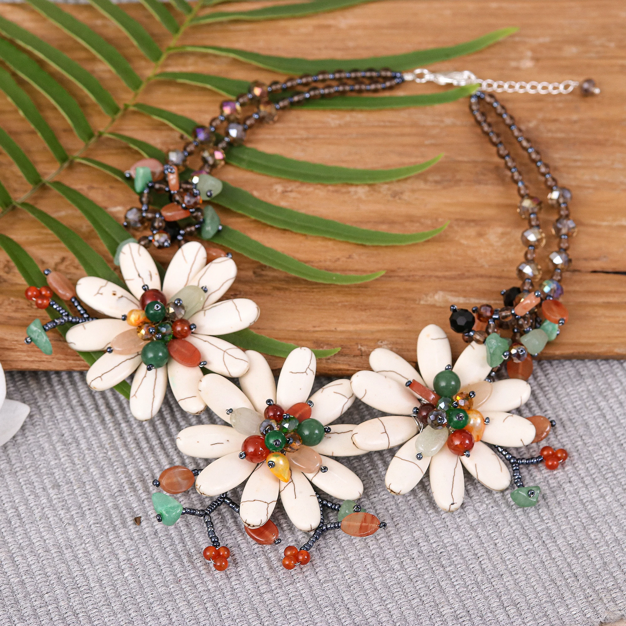 Bursting with botanical brilliance, this statement necklace showcases a spectacular tropical floral pendant where gemstones gather like petals kissed by morning dew. Thai artisan Nareerat arranges these precious blooms against a backdrop of vibrant calcite, aventurine, carnelian, cultured pearl and glass beads that encircle the neck in a symphony of color.